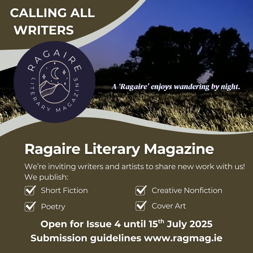 Ragaire Literary Magazine’s open call for poetry, short stories, creative nonfiction and cover art for Issue 4 will close on July 15th.